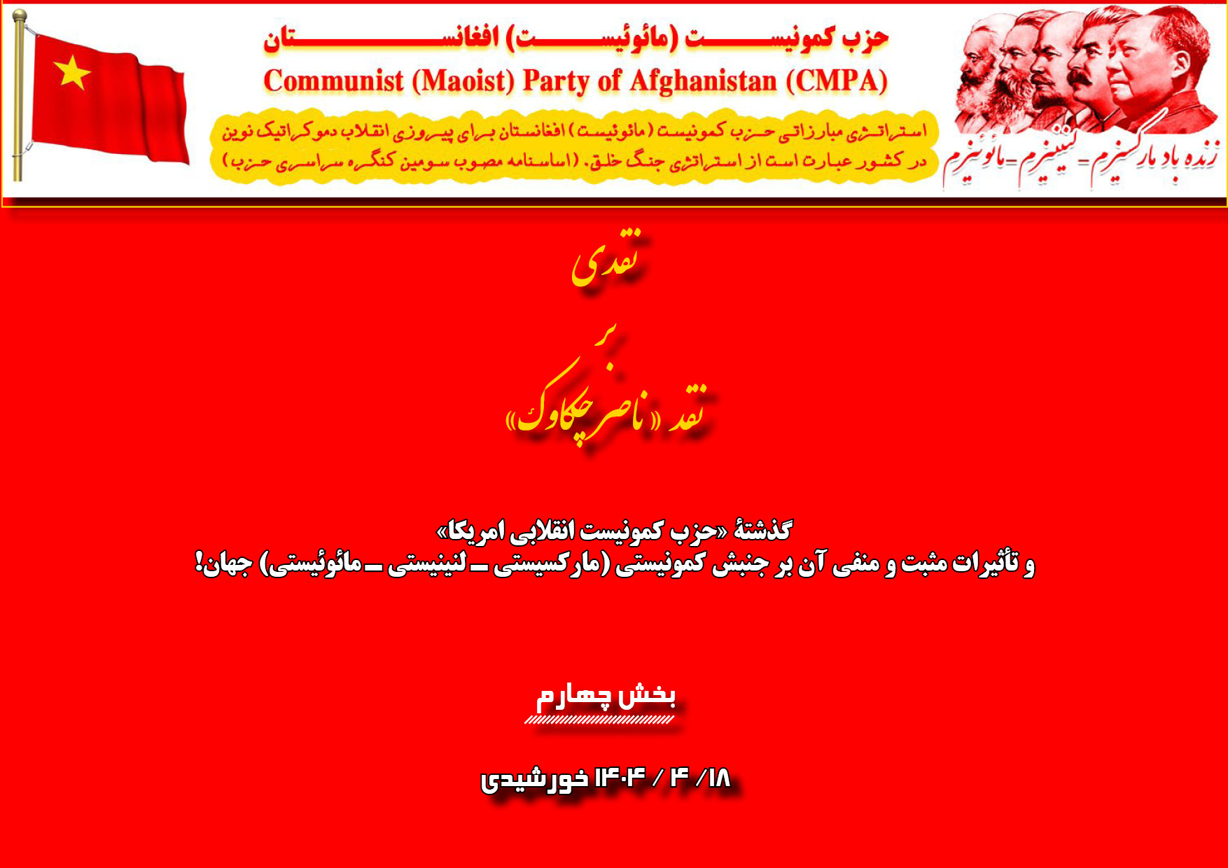 گرامیداشت آنان به معنای احترام عاطفی نیست، بلکه پایبندی به ضرورت سازمانیافتگی پرولتری، استقلال ایدئولوژیک، و تداوم خط مبارزاتی جنبش کمونیستی (مارکسیستی – لنینیستی – مائوئیستی) در افغانستان است.