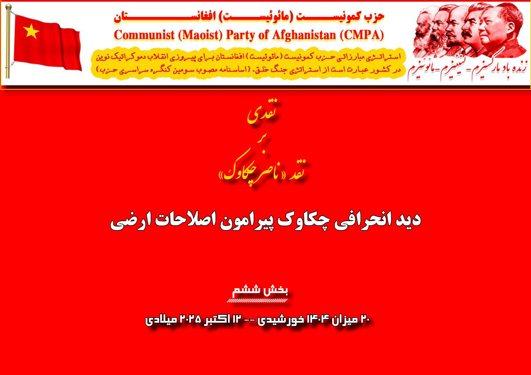 با مشخص نمودن ماهیت ارتجاعی و رفرمیستی “حزب دموکراتیک خلق افغانستان”، نظرات جناب چکاوک را در مورد “اصلاحات ارضی” پی میگیریم. جناب چکاوک در سندش چنین مینگارد: