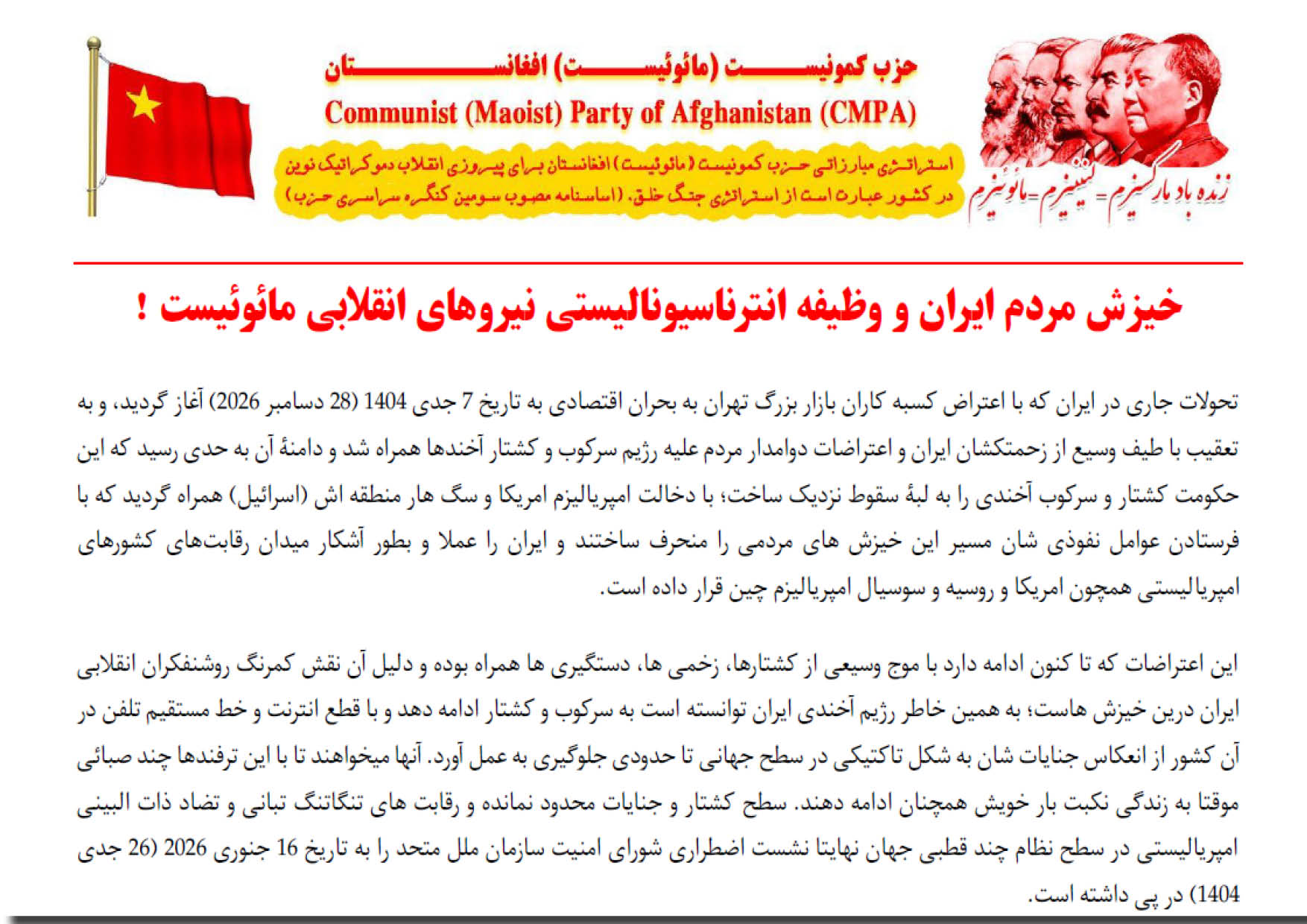 تحولات جاری در ایران که با اعتراض کسبه کاران بازار بزرگ تهران به بحران اقتصادی به تاریخ 7 جدی 1404 (28 دسامبر 2026) آغاز گردید، و به تعقیب با طیف وسیع از زحمتکشان ایران و اعتراضات دوامدار مردم علیه رژیم سرکوب و کشتار آخندها همراه شد و دامنۀ آن به حدی رسید که این حکومت کشتار و سرکوب آخندی را به لبۀ سقوط نزدیک ساخت؛ با دخالت امپریالیزم امریکا و سگ هار منطقه اش (اسرائیل) همراه گردید که با فرستادن عوامل نفوذی شان مسیر این خیزش های مردمی را منحرف ساختند و ایران را عملا و بطور آشکار میدان رقابتهای کشورهای امپریالیستی همچون امریکا و روسیه و سوسیال امپریالیزم چین قرار داده است.