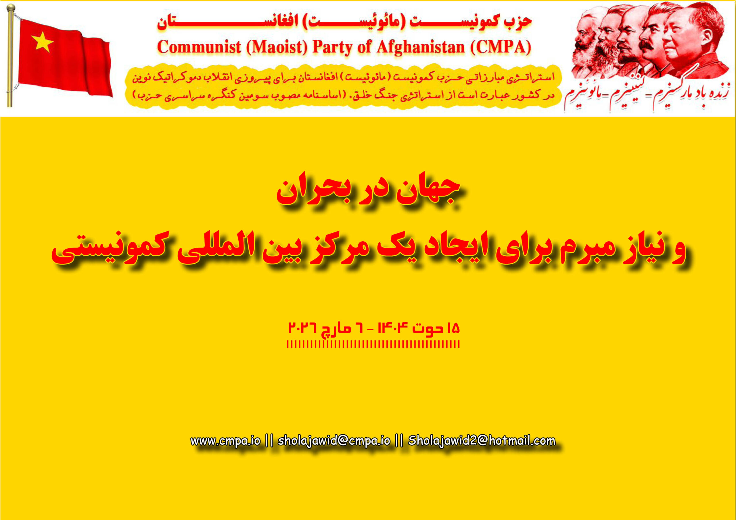 فایل PDFدریافت فایل انگلیسیدریافت زمان مطالعه: 4 دقیقه. بر همهگان واضح و مبرهن است که امروز تضادهای امپریالیستی در جهان در حال تشدید شدن است. امپریالیستها به خاطر تجدید تقسیم جهان جنگهای غارتگرانه را براه انداخته اند. آنها تلاش دارند بحران جهانی را از طریق همین جنگهای غارتگرانه و تحمیلی از طریق آماده سازی برای جنگهای ارتجاعیتر و شدیدتر پشت سر گذارند. جنگ ناعادلانه در اوکراین میان امپریالیزم روسیه و دولت اوکراین، جنگ ارتجاعی و ناعادلانه امپریالیزم امریکا و سگ هارش (اسرائیل) به ایران، جنگ ارتجاعی تحمیلی و ناعادلانۀ دولت اسرائیل به نوار غزه و لبنان و جنگ ارتجاعی و دولت پاکستان با امارت اسلامی افغانستان، همه و همه بیانگر تشدید تضاد میان امپریالیستها به خاطر تقسیم مجدد جهان است. امپریالیستها این جنگها را از یک طرف به خاطر سرکوب مقاومت تودههای ستمدیده به راه انداختند و از سوی دیگر به خاطر تقسیم بازارها و حوزههای نفوذ با یکدیگر رقابت مینمایند. در چنین شرایطی نیروهای مارکسیست ـ لنینیست ـ مائوئیست جهان از یک مرکز بینالمللی مائوئیستی محروم است. امروز مبارزه برای ایجاد یک مرکز بینالمللی وظیفه عاجل و مبارزاتی همه مائوئیستها را تشکیل میدهد. حزب کمونیست (ماادامۀ مطلب