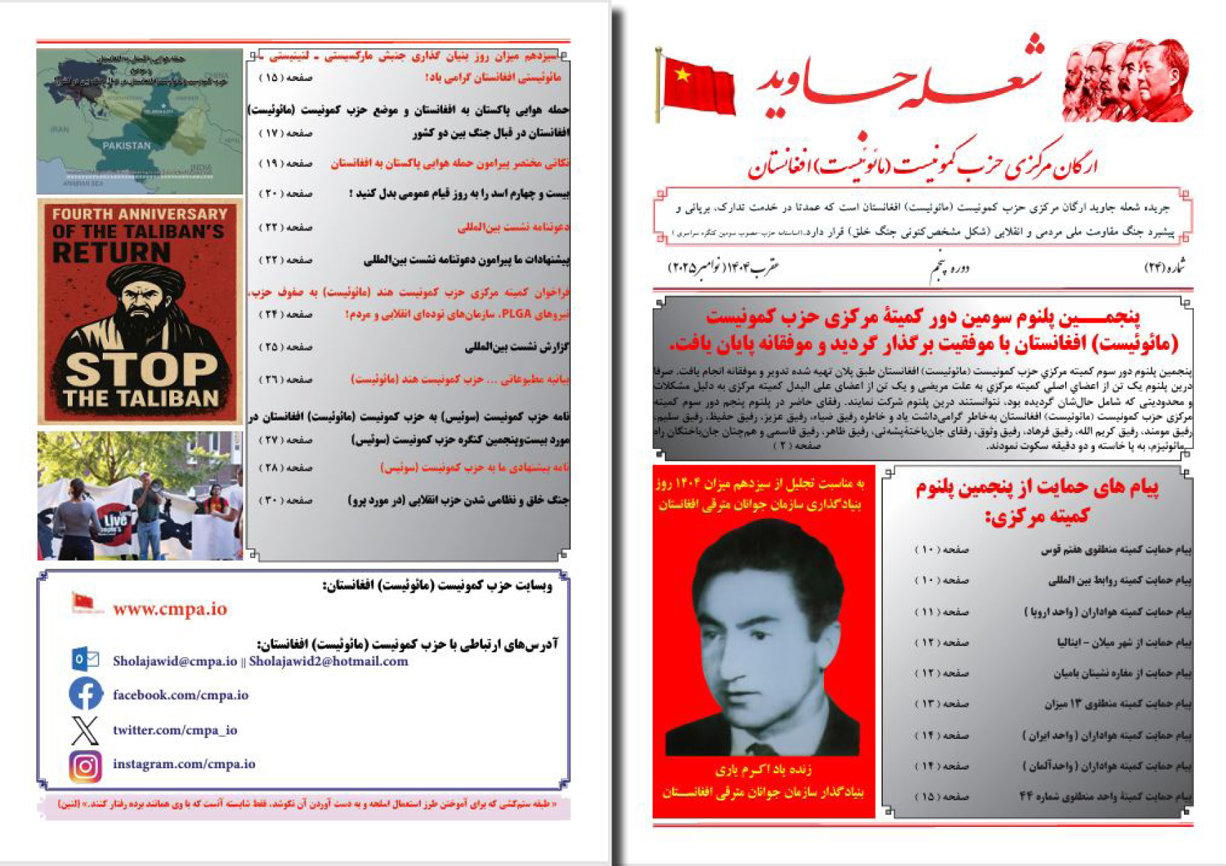 شماره 21-PDFدریافت شعله جاوید – ارگان مرکزی حزب کمونیست (مائوئیست) افغانستان جریده شعله جاوید ارگان مرکزی حزب کمونیست (مائوئیست) افغانستان است که عمدتا در خدمت تدارک، برپائی وپیشبرد جنگ مقاومت ملی مردمی و انقلابی ( شکل مشخص کنونی جنگ خلق) قرار دارد. (اساسنامه حزب-مصوب سومین کنگره سراسری) ادامۀ مطلب